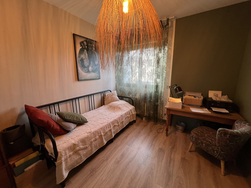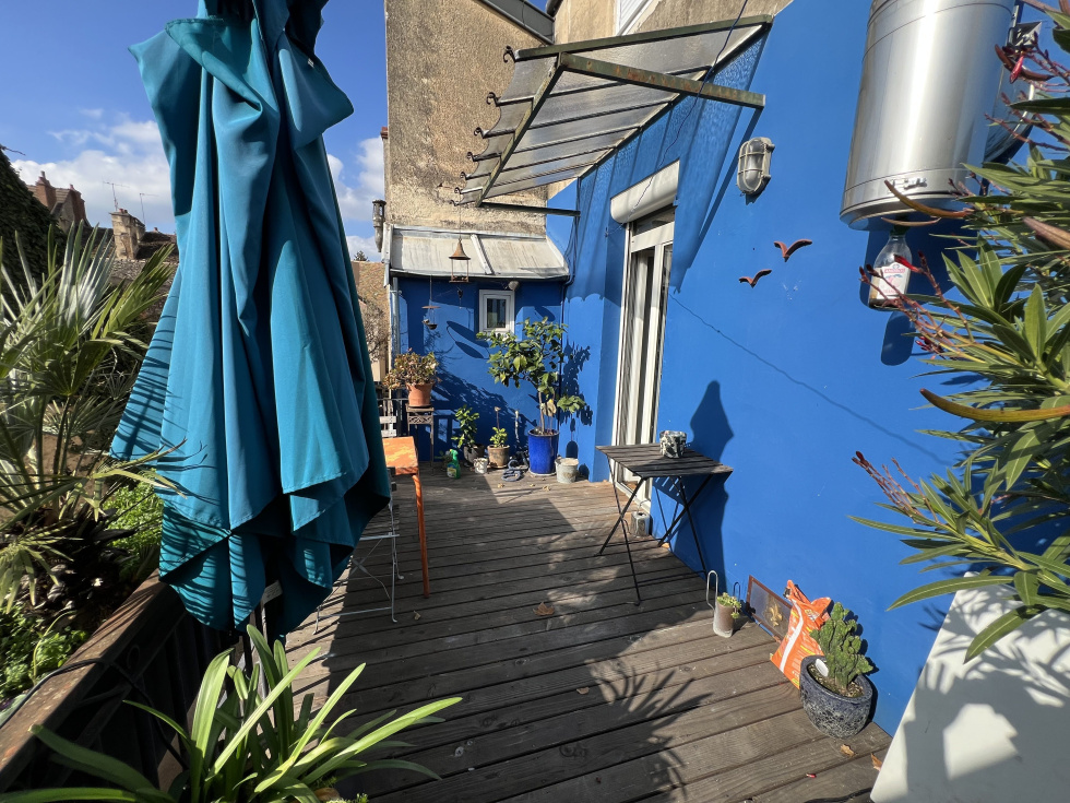Au 1er étage d'un petit immeuble très proche centre-ville : cosy appartement ancien rénové de type IV avec agréable terrasse de 18 m². Vue dégagée sur l'arrière.